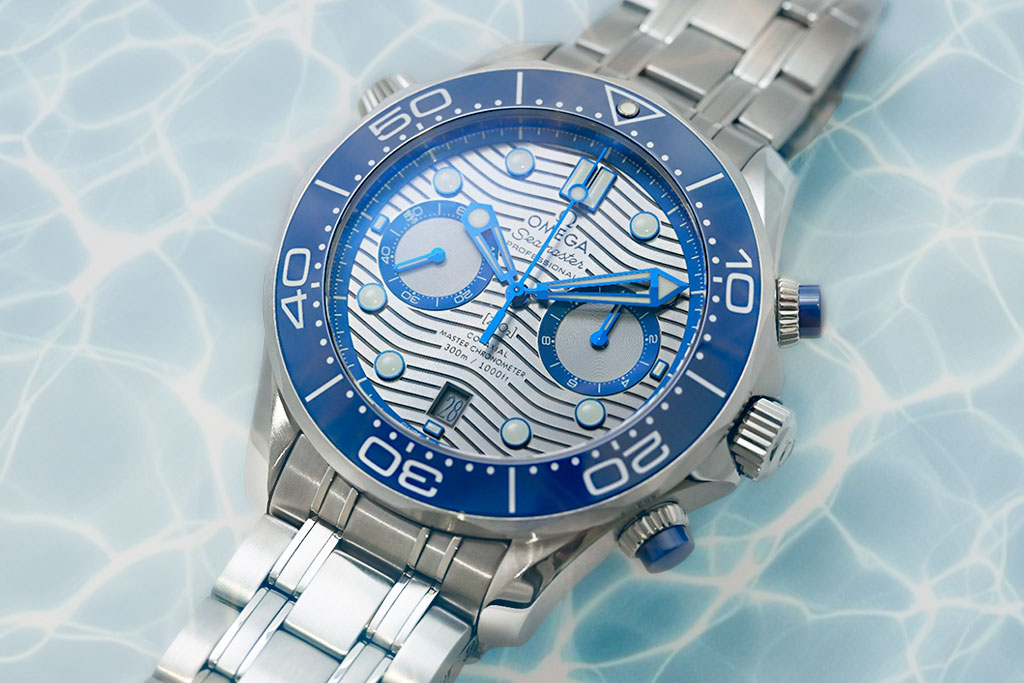 愛用するのは、「シーマスター アクアテラ(220.12.41.21.03.002)」。左右対称のシンプルな出で立ちのケースに、ヨットのウッドデッキを彷彿とさせる横縞の模様が施されたブルーの文字盤が印象的です。