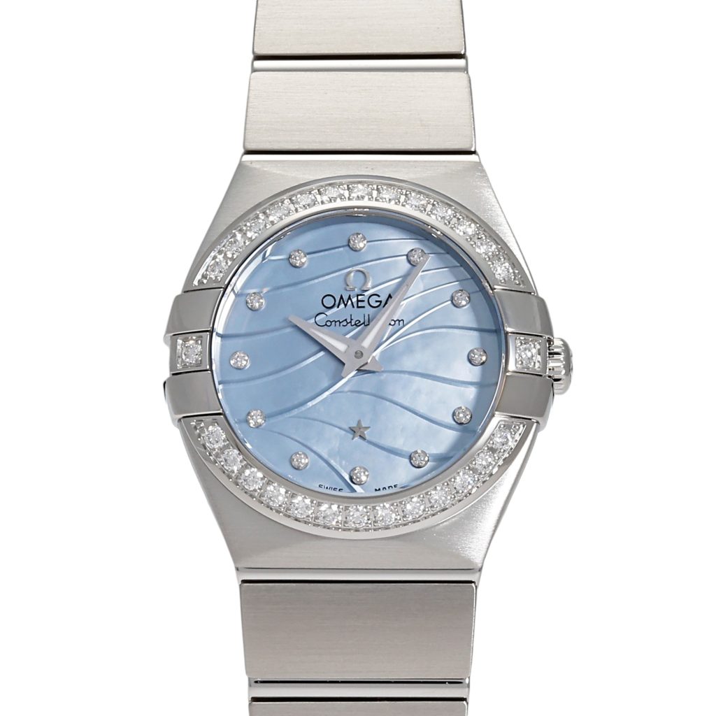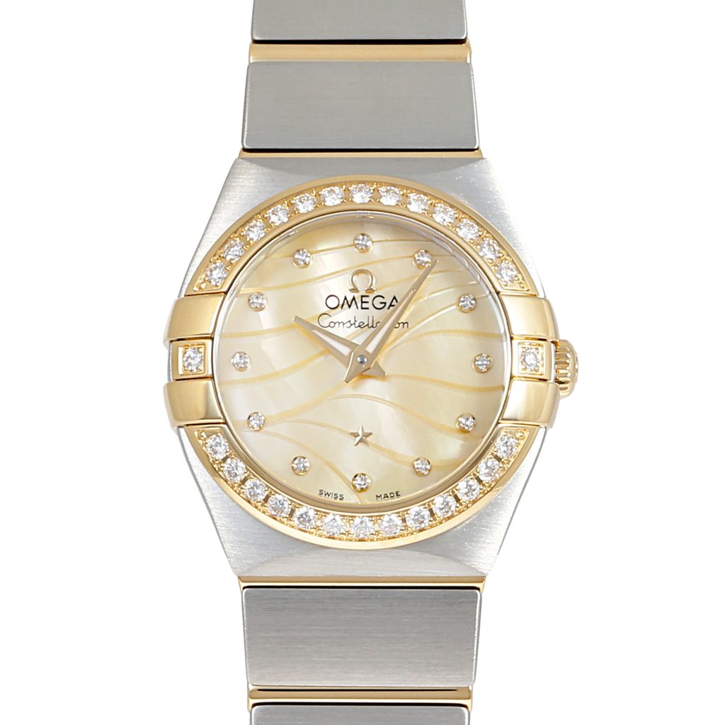 オメガを象徴する「爪」デザインを纏った、直径24mmの上品なタイムピースです。シャンパンカラーの天然マザーオブパールダイアルには、爪を起点に広がるような繊細な波模様が刻まれており、12石のダイヤモンドインデックスが、その静謐な美しさに上質な輝きを添えています。