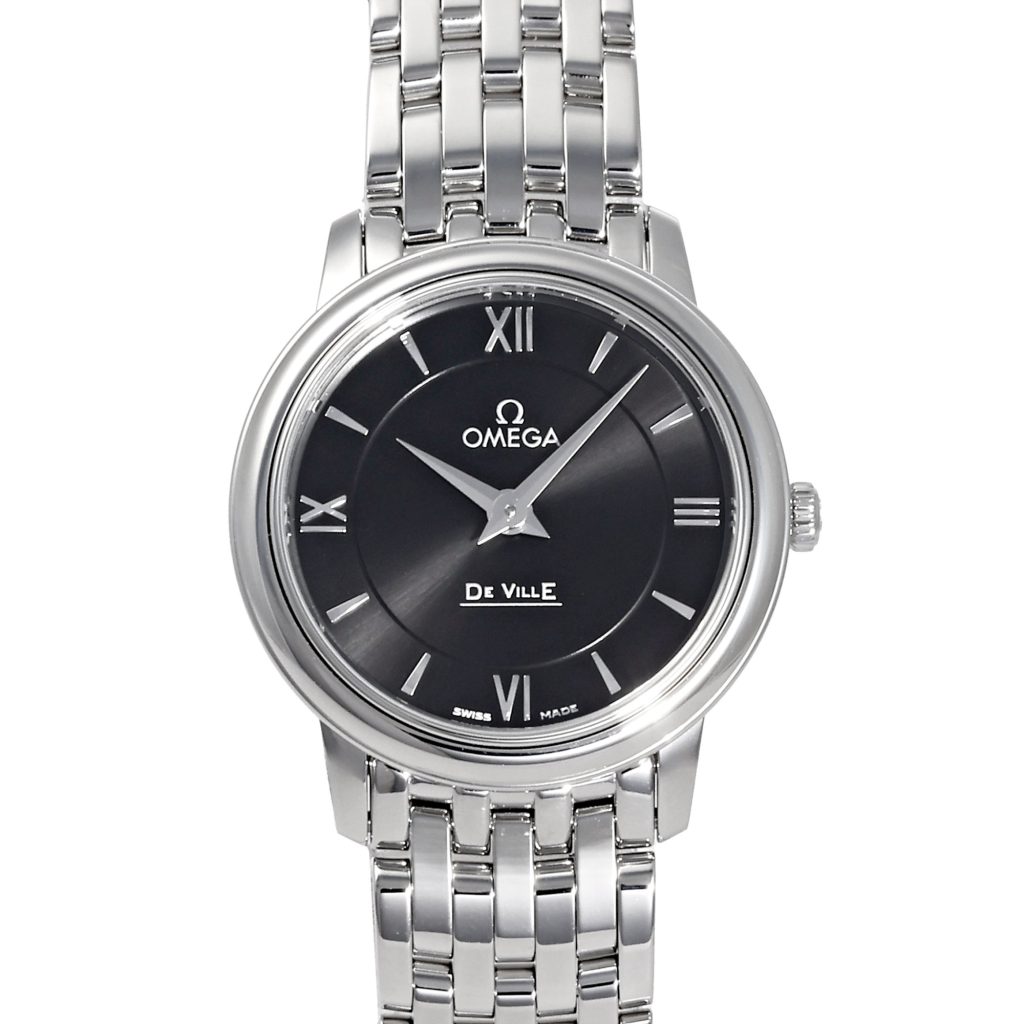 イエローゴールドの華やかさとは一線を画し、ステンレススティールならではの知性と洗練を感じさせる1本が、オメガのデ・ヴィル プレステージです。2つのゾーンに分かれた奥行きあるブラックダイアルには、クラシカルなローマ数字のアワーインデックスが配され、ミニマルでありながらも凛とした気品を漂わせます。