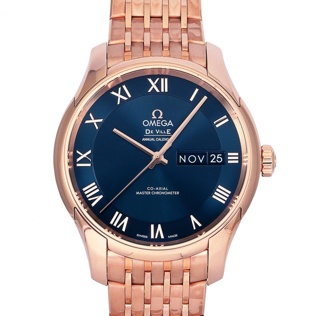 セドナゴールドが上品に輝くオメガ デ・ヴィル「433.50.41.22.03.001」は、落ち着いた深みのあるブルーダイヤルと相まって、洗練された佇まいを演出しています。3時位置にはアニュアルカレンダー機構を備えており、うるう年を除いて年に一度の調整だけで正確な日付表示を維持できる優れた実用性を備えています。