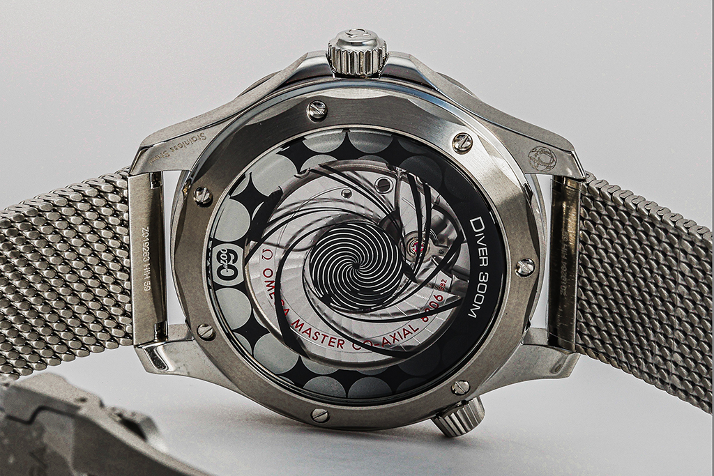 ダイアルには銃身をモチーフにしたデザインを採用し、10時位置のインデックスには暗所で「50」の数字が浮かび上がる特殊な仕様に。12時位置のマーカーとケースバックにはボンド家の紋章、7時位置には「007」ロゴを配し、ファンへのこだわりが随所に表現されています。