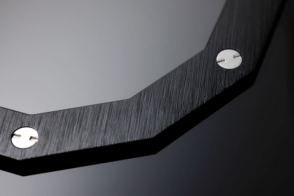 リチャード・オーリンスキーの芸術的アプローチが凝縮された「549.NI.1270.NI.ORL23」は、ケースのみならずブレスレットにまで多面カットの美しい造形が施された、フルチタニウム仕様の限定モデルです。これまでのオーリンスキー・コレクションでは主にケースに施されていた幾何学的な加工が、本作ではブレスレットにも及び、彫刻作品のような一体感ある美しさを実現しています。