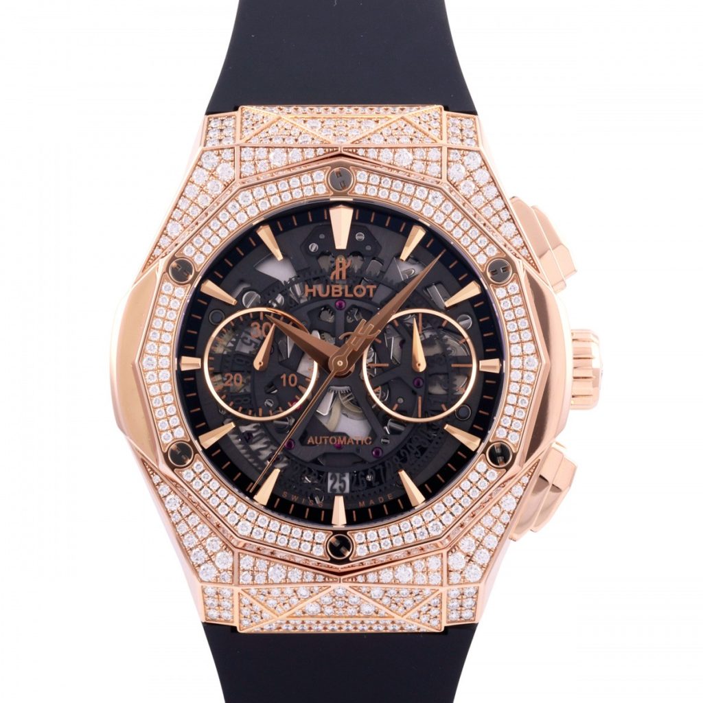 ブラックのスケルトンダイヤルとラバーストラップが、煌びやかな外装に程よいコントラストを添え、全体として調和のとれた仕上がりとなっています。舷窓を思わせる独自のベゼルデザインも健在で、ウブロらしい個性をしっかりと主張。華やかさと存在感を兼ね備えた、特別な1本をお求めの方にふさわしいモデルです。