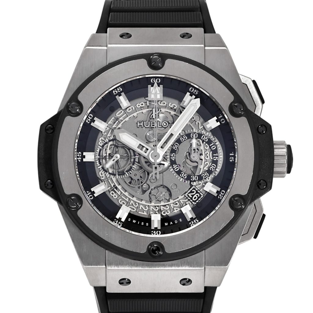 「701.NX.0170.RX」は、ウブロを象徴する「ビッグバン」のデザインを踏襲しつつ、さらなる進化を遂げた「キングパワー」シリーズに属するモデルです。存在感のある48mmのケースは、シリーズ最大級のサイズを誇り、それに合わせてプッシュボタンやリューズなどの各パーツも一層力強くデザインされています。