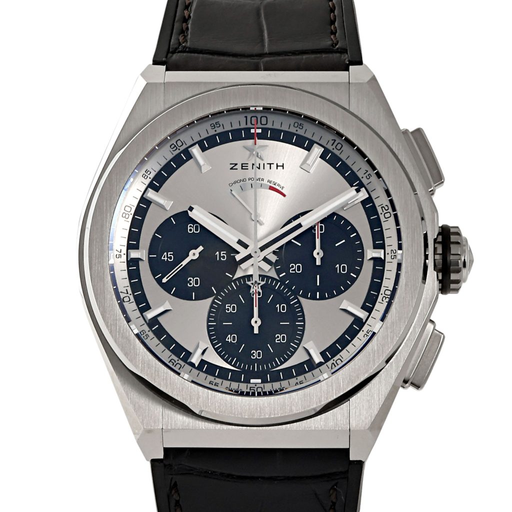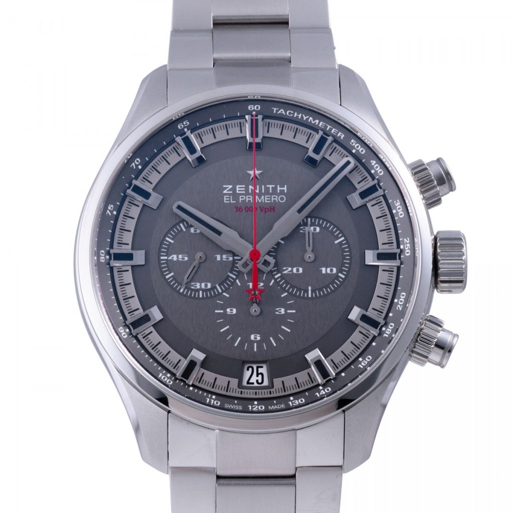 心臓部には、毎時36,000振動を誇る高精度クロノグラフムーブメント「エル・プリメロ400B」を搭載。1/10秒単位の計測を可能にするその性能は、ゼニスが築いてきたクロノグラフの伝統と技術力の結晶といえるでしょう。