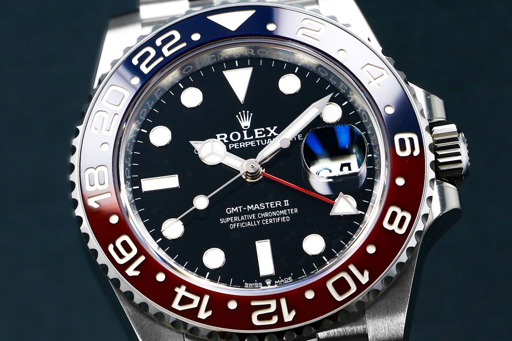 赤と青のベゼルが象徴的な「ペプシ」は、GMTマスターIIを語る上で欠かせない存在。ヴィンテージのRef.16710から現行のRef.126710BLROまで、世代を超えて支持されています。