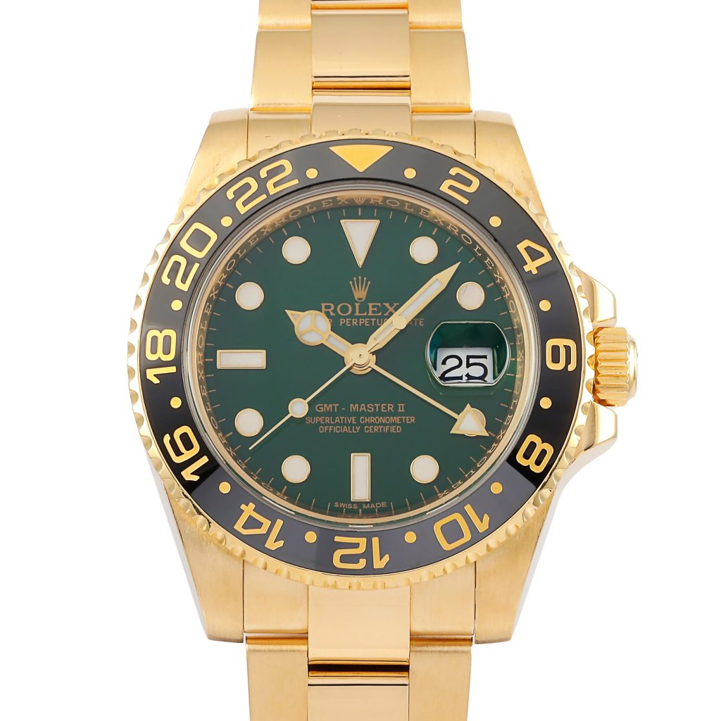 Ref.116718LNは、GMTマスターII誕生50周年を記念して2005年に登場した18Kイエローゴールド製の特別モデルです。ブラックセラクロムベゼルとグリーンダイヤルの組み合わせは、ロレックスのブランドカラーを象徴するデザインであり、高級感と独自性を兼ね備えています。
