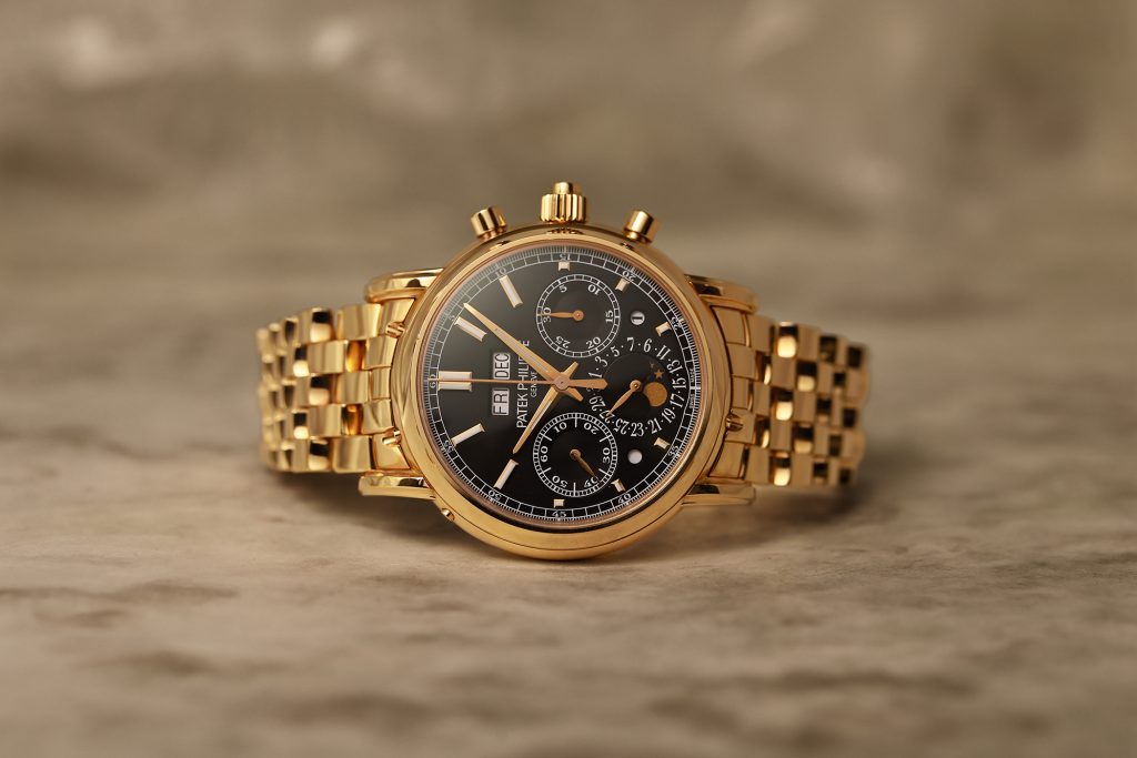 その背景には、①永久カレンダー+スプリットセコンドクロノグラフ(ラトラパンテ)という最難関コンビネーション、②ローズゴールド×ブラックオパーリンの絶妙な美学、③パテックの中でもトップクラスに資産価値が安定したモデル、という三拍子が揃っていることが挙げられます。