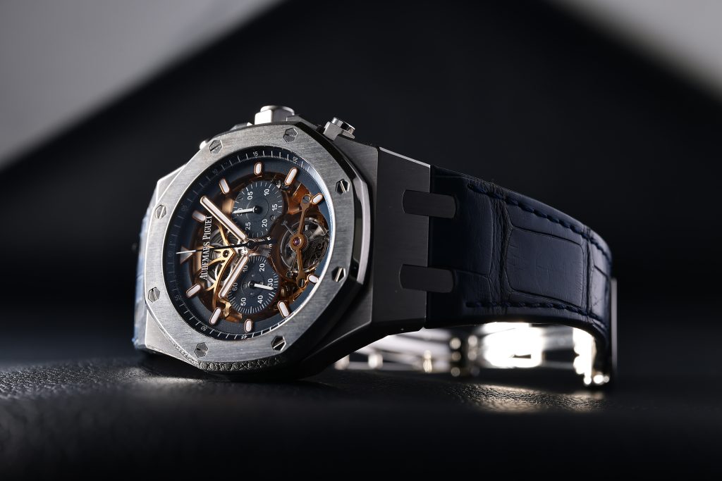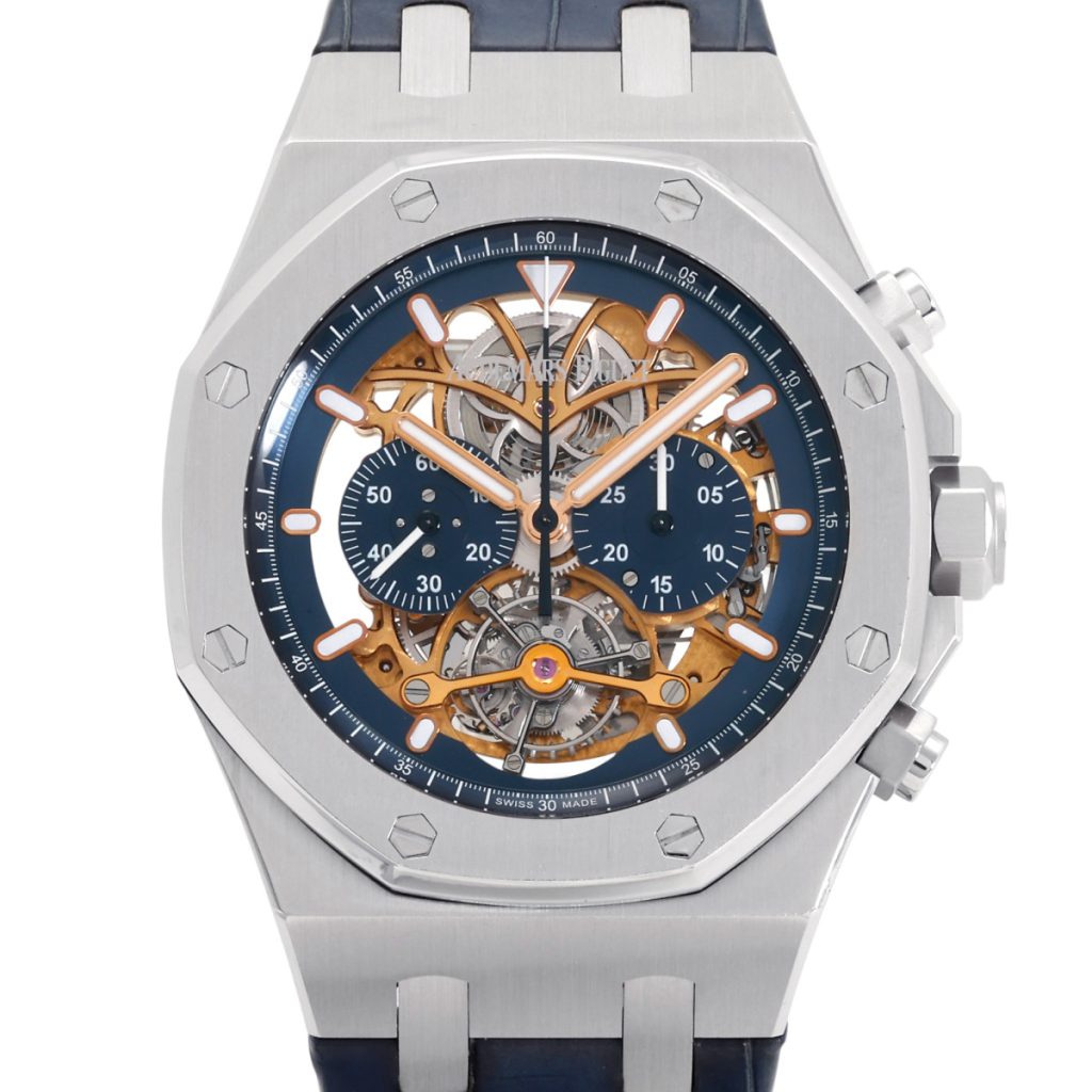 オーデマ・ピゲのロイヤルオークに搭載された高度なトゥールビヨン機構は、重力による精度誤差を補正しつつ、スケルトン構造による立体的な美観を実現した一本です。プラチナケースが放つ圧倒的存在感に加え、クロノグラフとの複雑機構は同社の技術力の象徴。トゥールビヨンの魅力である「機械の動きを魅せる芸術性」と「精密な時計製造技術」が最もダイナミックに感じられるモデルとして、世界のコレクターから高い評価を得ています。