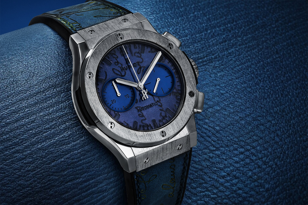 クラシックフュージョン ベルルッティ スクリットオーシャンブルーは、ウブロと名門シューメーカー「ベルルッティ」が手を組んで誕生した、唯一無二の特別モデルです。1895年創業のベルルッティが誇る「ヴェネチアレザー」を贅沢に採用し、その美しい発色と滑らかな質感が文字盤とストラップを飾ります。