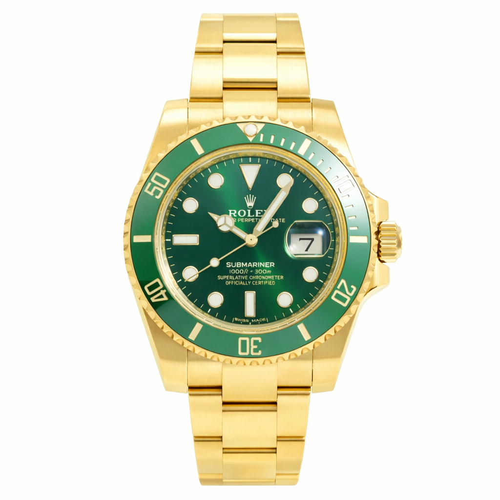 重厚なイエローゴールドのケースに、深いグリーンのベゼルと文字盤。