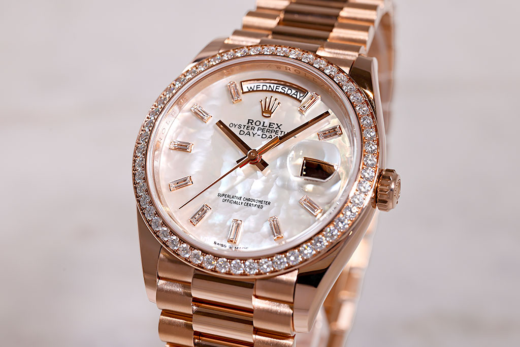 デイデイトはロレックスの最上位コレクションとして、高いステータスを誇るモデルです。素材には厳選された貴金属のみが使用され、またロレックス独自開発の最新鋭ムーブメントは、デイデイトへいち早く採用されるなど、ロレックスのコレクションの中でも特別な存在であることがわかります。