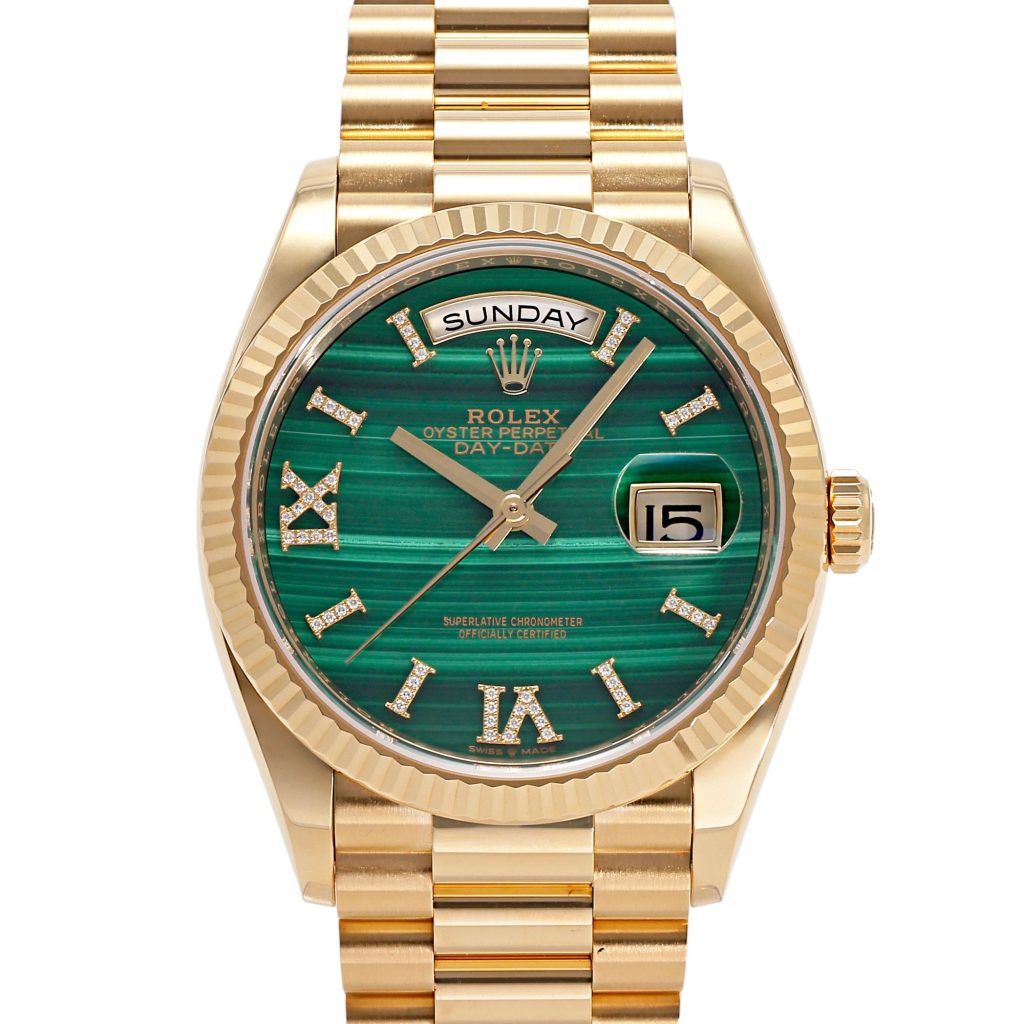 デイデイト 36 128238は、直径36mmのやや大きめなケースサイズが特徴で、レディースモデルとしては存在感のある1本です。文字盤には、深みのある美しいグリーンが魅力のマラカイトを採用し、天然石ならではの豊かな表情が印象的です。