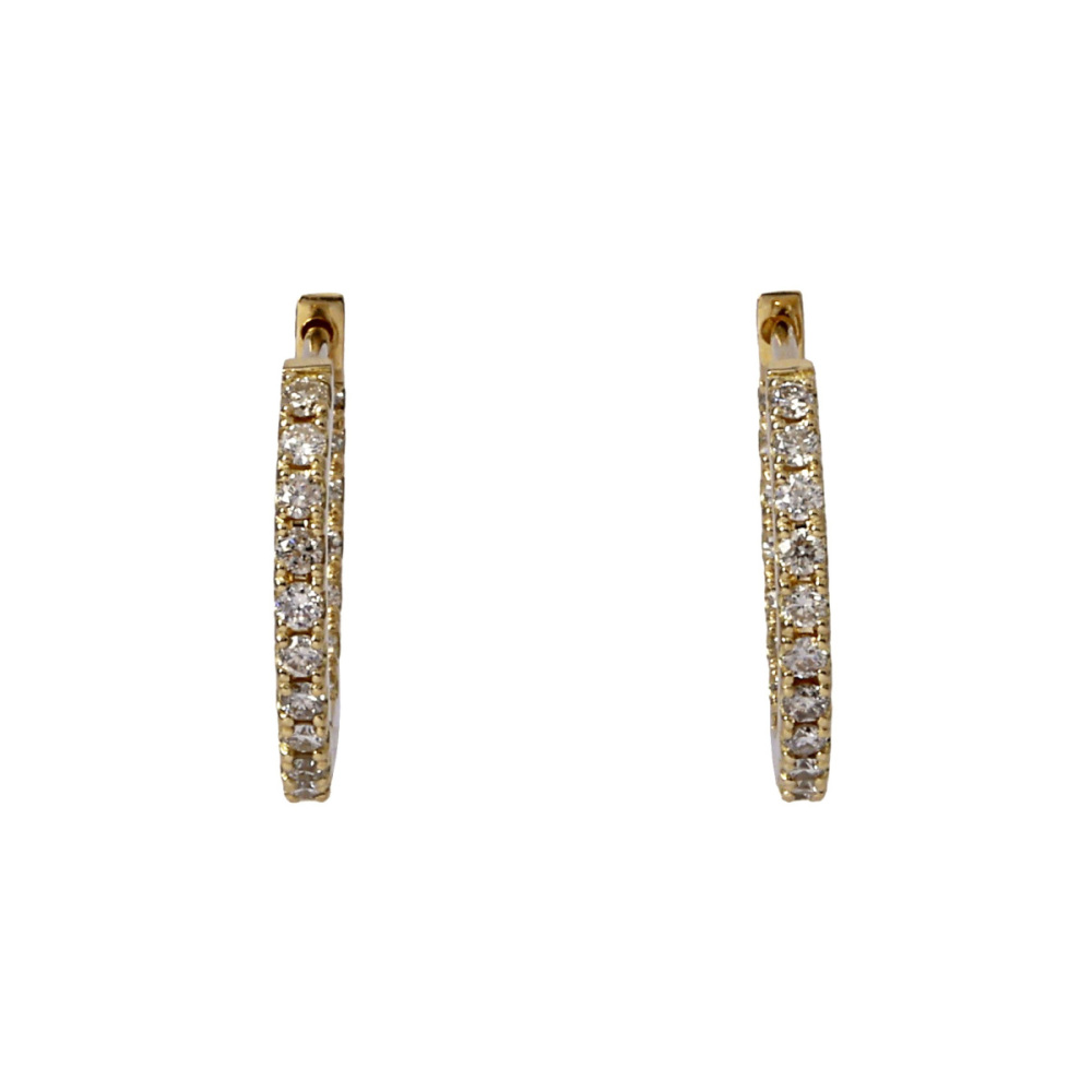外側半分と内側半分にダイヤが付いており、正面から見たときに全面にダイヤが付いているように見えてとても煌びやかなフープ型ピアスです。見る角度によって印象が変わる楽しみもございます。