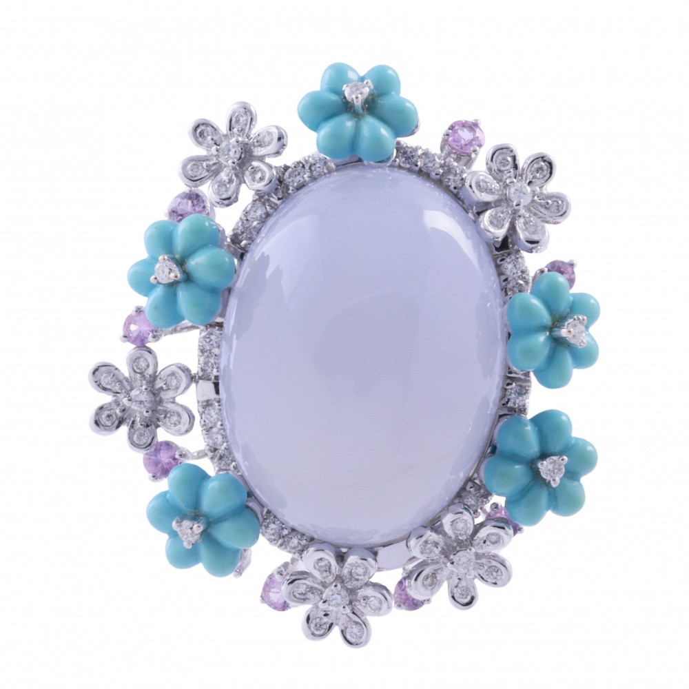 K18ホワイトゴールド カルセドニー トルコ石 ダイヤモンド サファイア リング
