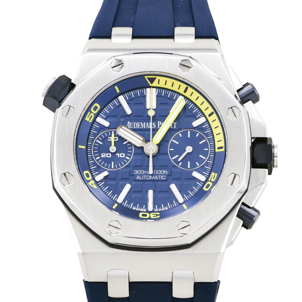 2010年、本格的にコレクションに加わった「ロイヤル オーク オフショア ダイバー」は、視認性に特化した本格的なダイバーズウォッチです。ブルーの文字盤にイエローが特徴的なこちらのモデルは、計4種類のカラー展開で各色400本限定で生産されたモデルになっています。ダイビング時間が読みとりやすいよう、文字盤に近いインナー回転ベゼルに潜水時間の目盛がつけられたことで、存在感のあるフォルムでありながらもスタイリッシュな印象を与えます。クロノグラフ機能を搭載しながら、従来と変わらず300mの防水機能を保っています。