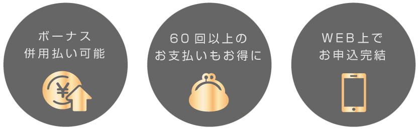 通販サイトでお手続きの場合はご来店やクレジットカード不要。全国どこからでもお申込みいただけます。お申し込み時の捺印も不要、審査もスピーディーなお支払い方法です。