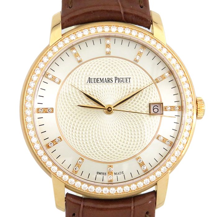 ピンクゴールドケースにベゼルと文字盤にラウンドブリリアントカットのダイヤモンドがセッティングされたラグジュアリーなモデルです。