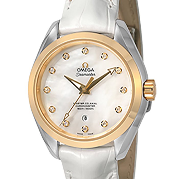 「シーマスター アクアテラ マスター コーアクシャル」/業界で最先端の自社製機械式ムーブメントである「マスター コーアクシャル」を搭載した「シーマスター アクアテラ マスター コーアクシャル」は、スタイリッシュでスポーティーなモデルで、アウトドアでの活発なライフスタイルも輝かせてくれます。このモデルには、インデックスに12個のダイヤモンドが施され、ホワイトのマザーオブパール製ダイアルがセットされています。