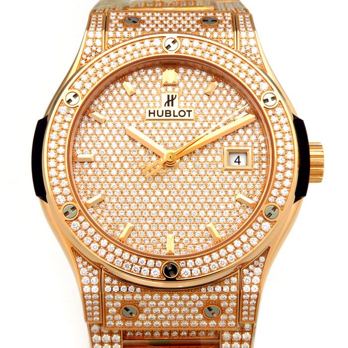 ブレスレットタイプで全面ダイヤモンドで仕上がった豪華な1本です。ケース素材はウブロ独自で開発した経年変化の少ない「キングゴールド」が使用されています。