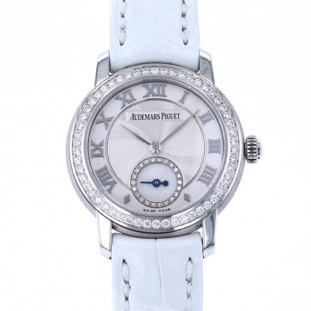 ホワイトゴールドケースにベゼルにはブリリアントカットのダイヤモンドがセッティングされており、女性の手首にきらめくゴージャスでエレガントなモデルです。
