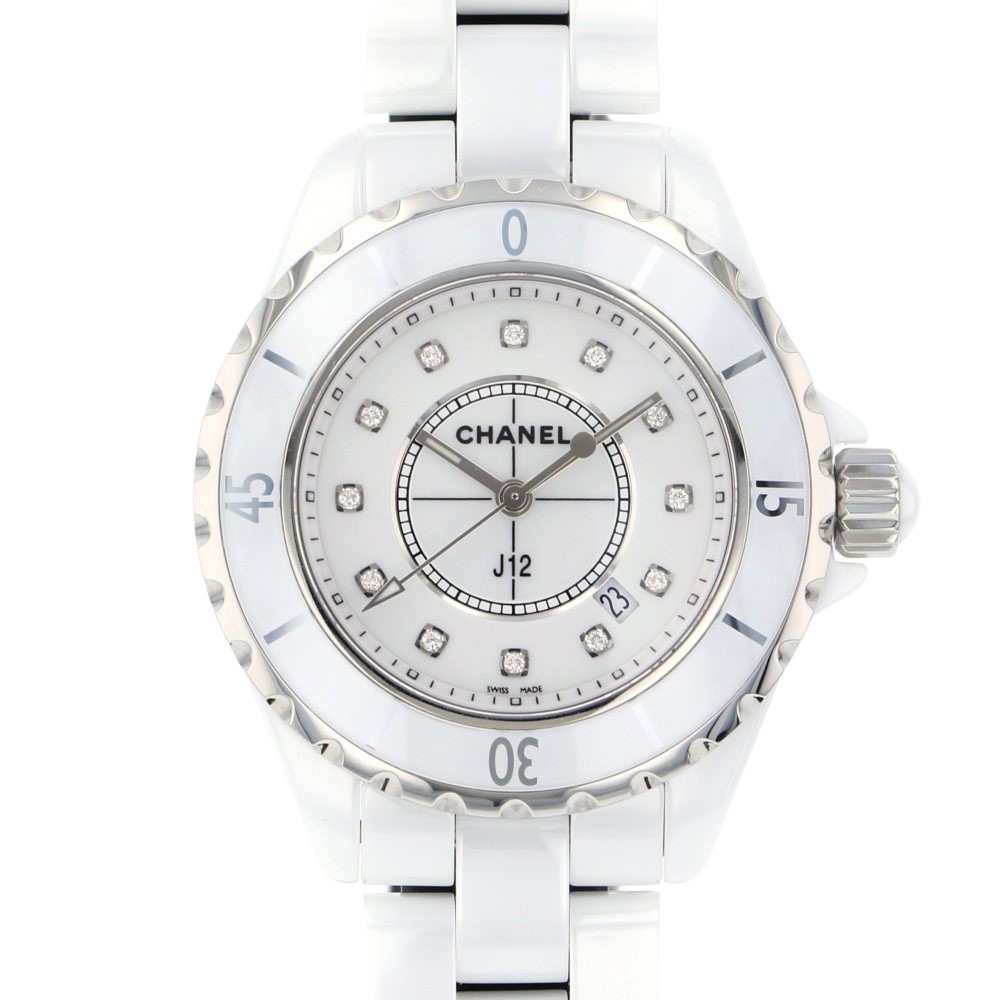 2000年に華々しいデビューを飾り、名実ともにシャネルウォッチの代表作となった「J12」シリーズ。セラミックをケースとブレスレットに採用するという斬新な作りが魅力的で、発売当初から爆発的な人気になり、モデルチェンジをしながら進化を続けています。表面硬度が高くて傷になりにくいセラミックという素材の特性により、長く綺麗な状態でお使いになれるでしょう。ケース、ブレス、文字盤と真っ白で爽やかなモデルです。ダイアルのインデックスにセットされた12粒のダイヤが、さりげない華やかさを印象づけます。