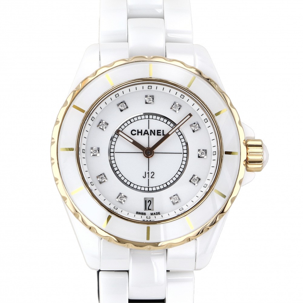 セラミックとピンクゴールドとのコンビネーションモデル、シャネル J12 H2180 です。清楚なイメージのホワイトとピンクゴールドが目を引くJ12には珍しいモデルです。インデックスには11個のダイヤモンドを使用し、エレガントさの演出も忘れてはいません。