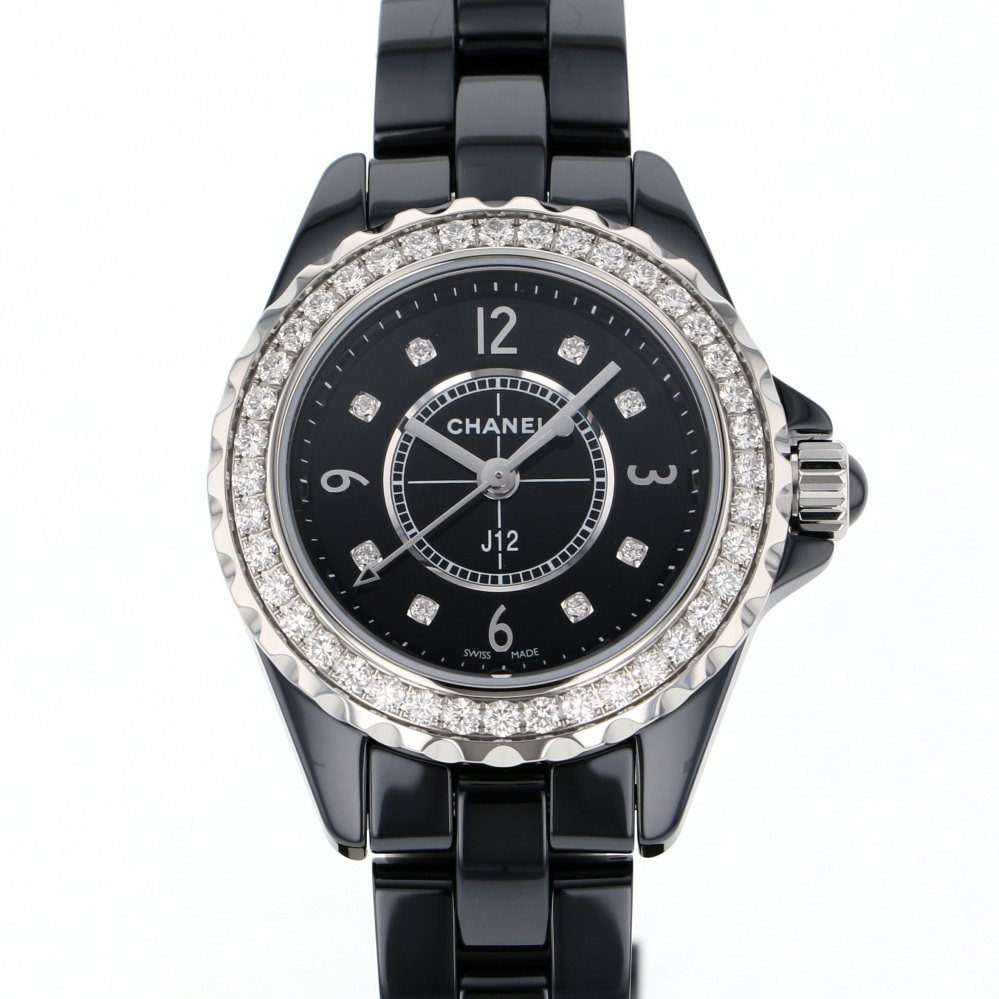 大人気のJ12モデル。スポーティなイメージがありますが、こちらは29mmのレディースサイズです。ベゼルとインデクスにダイヤモンドがセッティングされたラグジュアリーなモデルです。